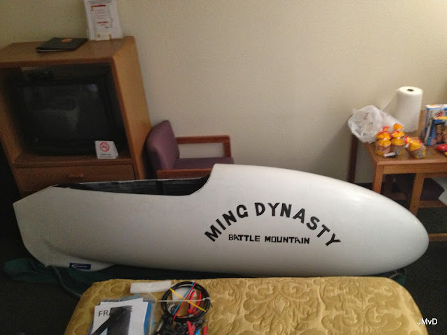 Then out to the five mile start for the first proper runs of the week. Dave in ARION1 lost his chain and coasted through at just under 40; this meant that Larry caught him in the timing traps and didn't get a time. Jun muttered "66" which, if accurate, is most heartening. I again drove the Cygnus chase lorry and was holding station on the bike with the cruise control set to 75 mph. 76.02 is also heartening as the wind was uncooperative and the rider reckons himself still a bit jet-lagged. The big news was that Todd Reichert did 81.66 in Eta, albeit with something of a following wind, which helps confirm our suspicions that the bike is a cut above the ordinary. Liz ran her unfaired handcycle over the five-mile course and was 6 mph quicker than she'd managed in the fully-faired machine. More testing to follow.